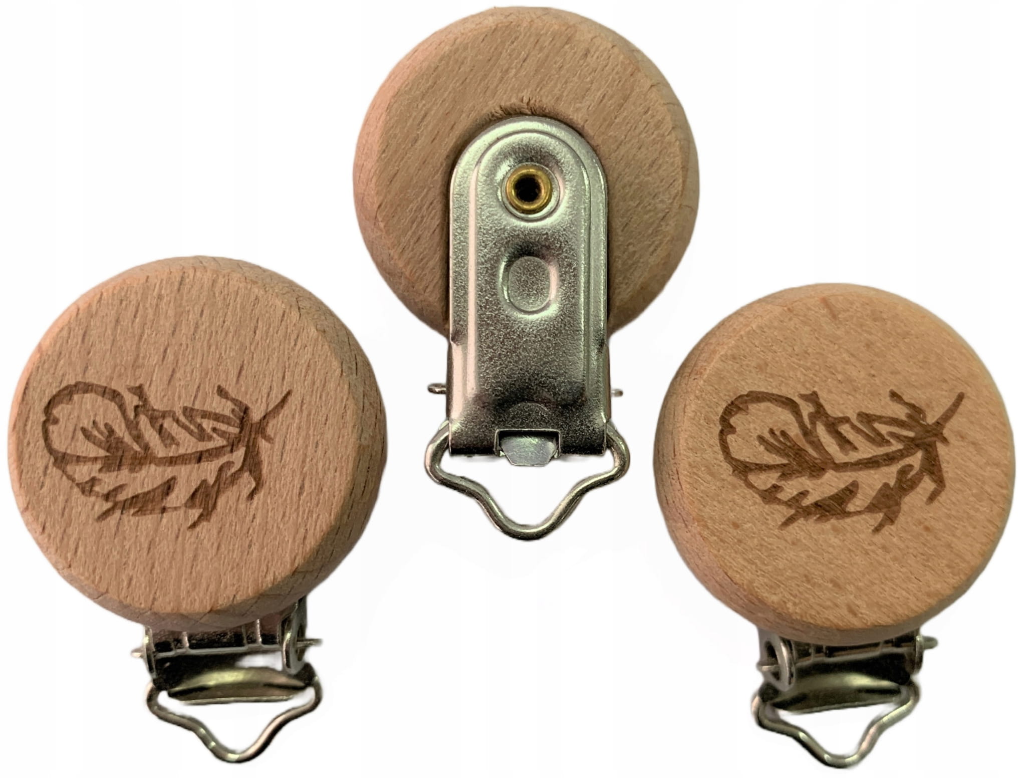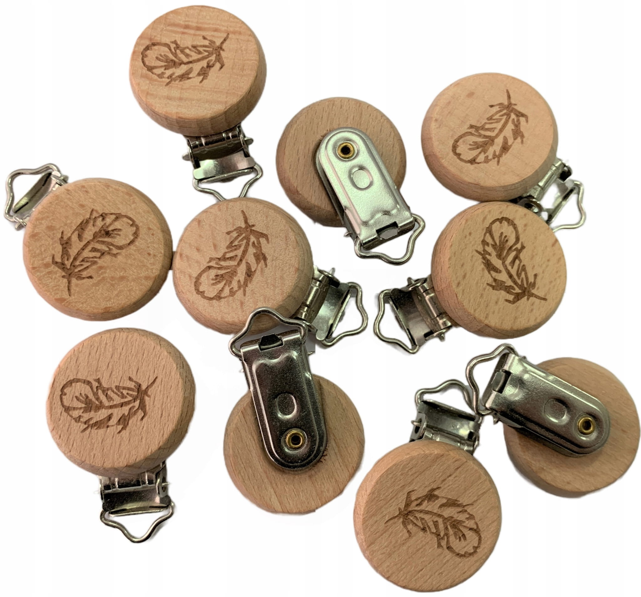 Drewniany klips zawieszka do smoczka gryzaka OKRĄGŁY BUKOWY z grawerem PIÓRKO