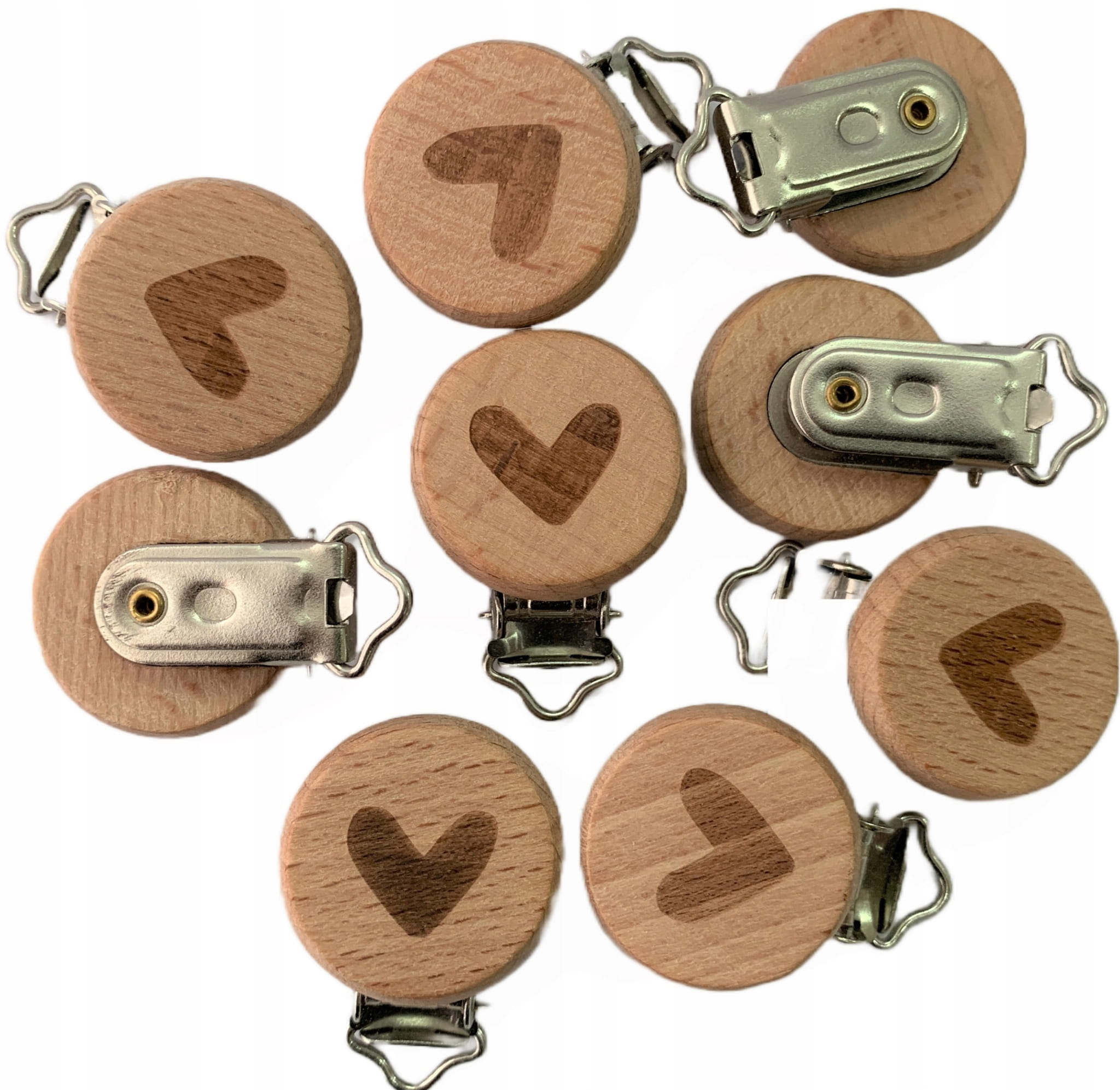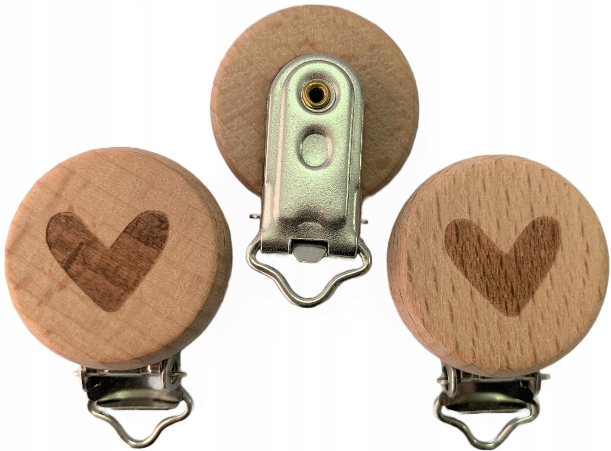 Drewniany klips zawieszka do smoczka gryzaka OKRĄGŁY BUKOWY z grawerem SERCE